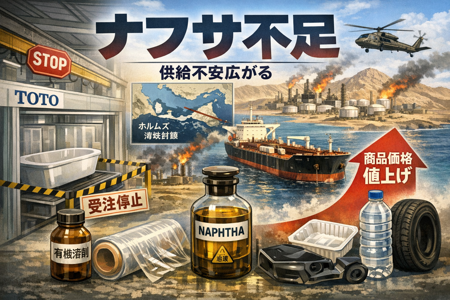 そのナフサが今、地政学リスクによって供給不安に直面しており、すでにTOTOの受注停止という形で現実化しています。