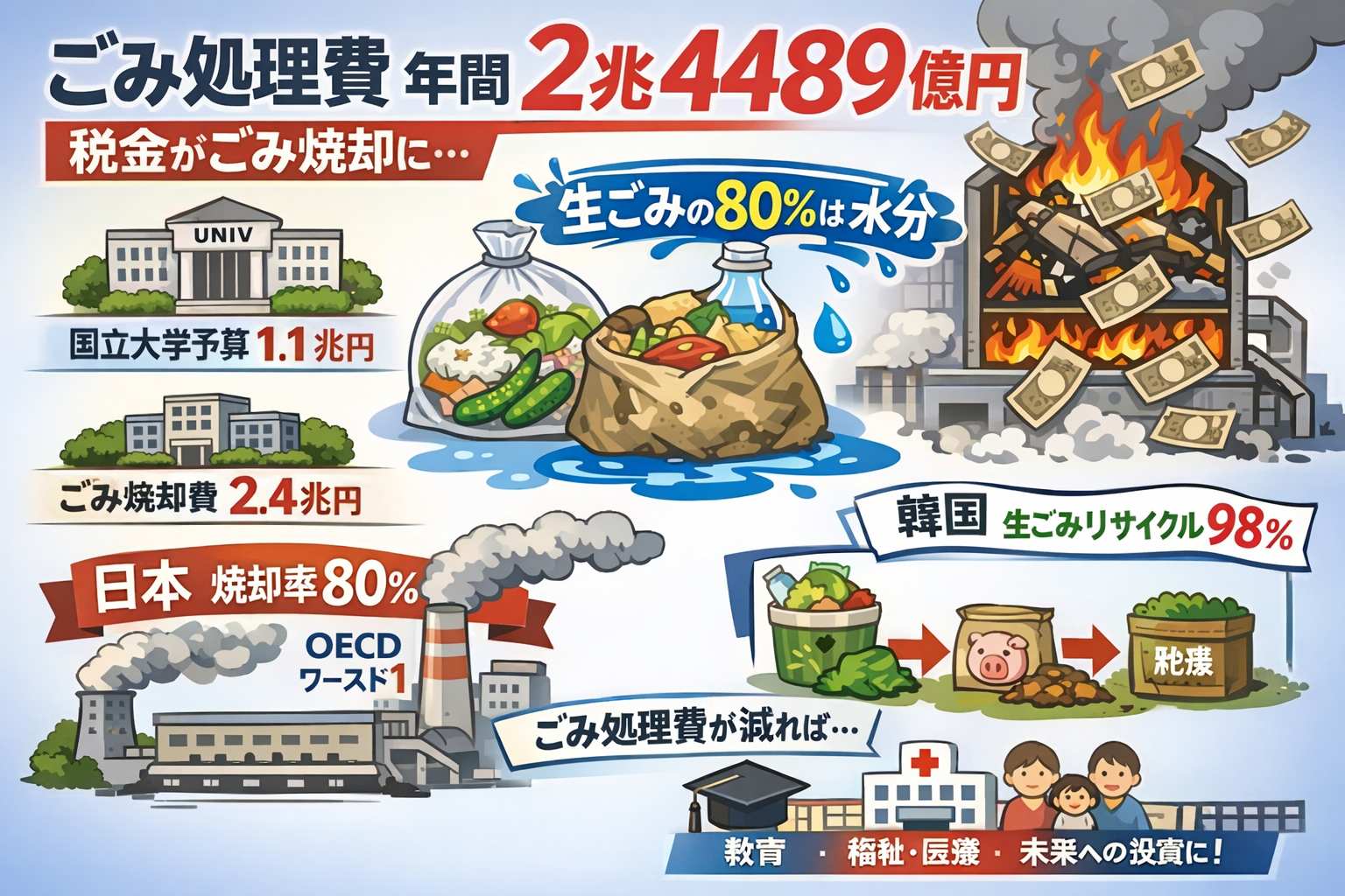 現在のごみ処理費2.4兆円は、国立大学の運営交付金(約1.1兆円)の2倍以上に相当します。