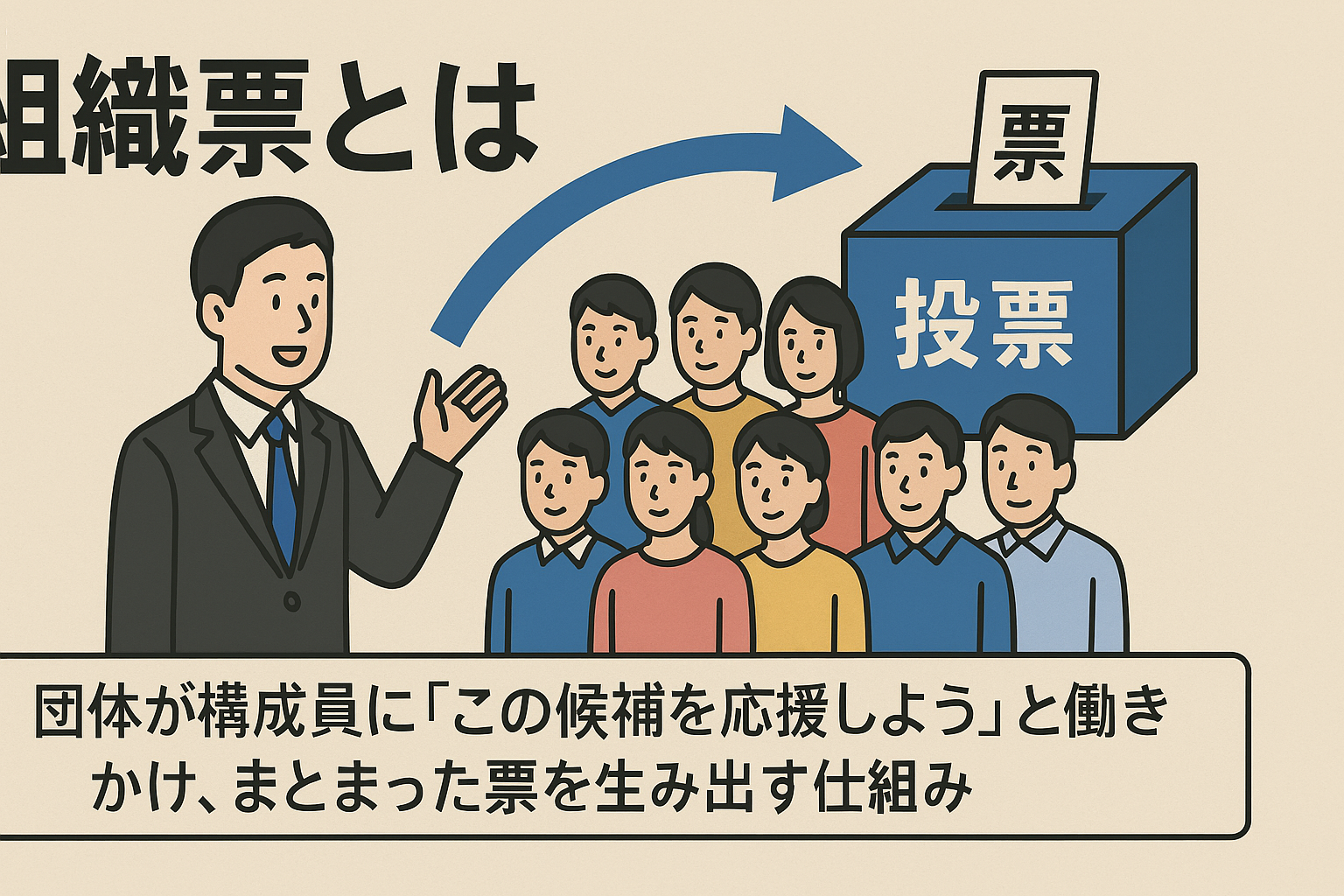 組織票とは、労働組合・業界団体・宗教団体など、特定の組織が構成員に対して「この候補を応援しよう」と呼びかけることで生まれる、まとまった投票行動のことです。